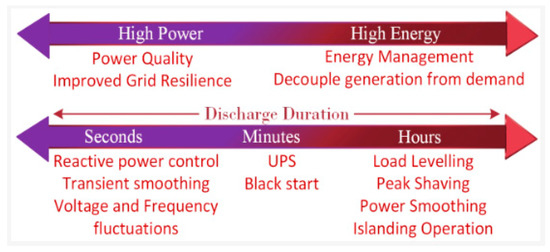 Energy storage system (ESS) application increases power availability, resilience, and stability for load demand. In the event that the primary power supply source fails or is insufficient, ESS functions as a backup power system. Load shedding, load leveling via energy storage system charging or discharging, power fluctuation smoothing, voltage and frequency fluctuation issues, and power quality improvement are additional areas where ESS can be useful, as shown in Figure 16. A classification of energy storage systems is presented in Table 1.