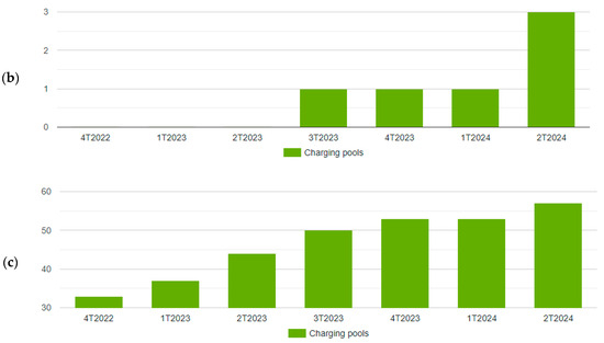 Number of charging poles between 2022 and 2024 [60], (a) in Morocco, (b) in Algeria, and (c) in Tunisia.