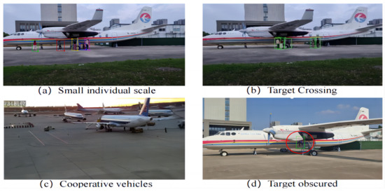 Disturbance of non-cooperative subjects in airport scenes. (a) Small individual scale. (b) Individual targets are obscured each other. (c) Cooperative vehicles. (d) Individual targets are obscured by cooperative vehicles.