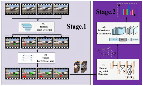 As shown in Figure 2, the proposed framework is composed of two stages: multi-scale non-cooperative human object location and matching and human keypoint detection and behavioral classification.