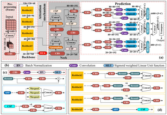 Improvements in the detailed structure of the YOLOX-s network. (a) Improved YOLOX-s main network structure. (b) Introduction of main module names. (c) Internal structure of the main modules. (d) Specific details of the 4-layer residual structure.