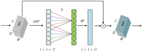The structure of the ECA module is shown in Figure 4. The ECA module allows all channels to share the weight information. The vector is the output obtained by convolving C in one dimension and then feeding it into the sigmoid function. ECA proposes an idea of adaptively generating the convolution kernel size according to the number of channels, which is calculated as shown in Formula (2).