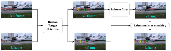 As shown in Figure 5, a Kalman filter [31] is introduced to predict the location of the target appearing in the frame k according to the target-related parameters captured in frame . If the target in frame k can be successfully detected, the target information detected in frame is associated with the target information in frame k.