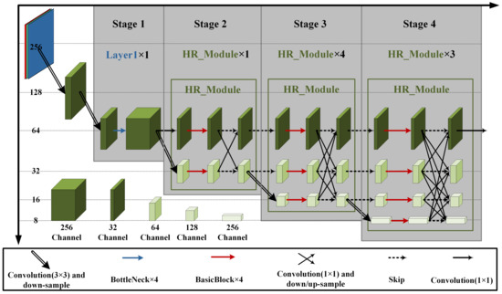 As shown in Figure 6, HRNet-w32 is a four-stage network consisting of one high-resolution main branch with the highest resolution and three high-to-low resolution branches that are added to the network one by one in parallel at the beginning of each new stage. The input for this stage is the sub-image from the original RGB surveillance image, and it is determined by the bounding box of each detected target. The first stage typically generates a feature map, where each pixel contains rich channel information (256 channels), and the spatial dimensions (i.e., the width and height of the feature map) are reduced to one-fourth of the original image size. In the subsequent second, third, and fourth stages, features are progressively extracted and integrated through parallel and multi-scale feature fusion.