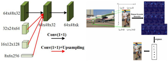 As shown in Figure 7, the four different scales of the feature maps in stage 4 are fused to obtain the final high-resolution feature output, which is mapped into a 64 × 48 × k heat map feature after one more 1 × 1 convolution operation. k represents the number of human keypoints. Figure 7 illustrates the prediction of each human keypoint locations using heat maps. According to the target frame information of target detection, the corresponding human target area is extracted.The region is input to the human keypoint detection network. The heat map features of each part of the human body are inputted at the regression side of the network in the form of regression heat maps. The argmax function is applied to compute the coordinates of the maximum response probability in the heat map, and these coordinates are then scaled and mapped back to the original image to obtain the final predicted coordinates of the human keypoints. The heat map is calculated as follows.