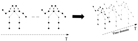 As shown in Figure 8, we utilize spatio-temporal graphs to form hierarchical representations of skeleton sequences. In particular, we construct a skeleton sequence of an undirected spacetime graph with N joints and T frames within interframe connections. The set of human keypoint nodes can be expressed as , where t represents the number of different frames and i represents the keypoint categories. The feature vector of a single node consists of its coordinates as well as the confidence level s. The set of edges can be denoted as , where one subset represents the natural connectivity relationship of the human skeleton morphology, H is the set of human keypoints, and the other subset represents the temporal relationship of the same keypoint categories between neighboring frames.