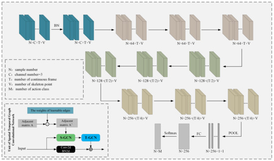 The spatio-temporal graph convolutional network (ST-GCN) [34] is introduced to perform feature extraction of human keypoints in graph structures. As shown in Figure 9, the unit of ST-GCN consists of an adjacency matrix, a weight matrix with learnable edge weights, a spatial graph convolution, a temporal graph convolution, and a residual structure (used to introduce the original skeleton information). The adjacency matrix is a matrix of size (V is the number of keypoint categories) obtained from the maximum paths of predefined neighboring points. It describes the connection relationship between each skeleton point. At each layer of the convolutional unit, a learnable weight matrix is introduced for the adjacency matrix. This weight matrix is of the same size as the adjacency matrix. It is initialized as an all-ones matrix and is updated along with the model training implementation.