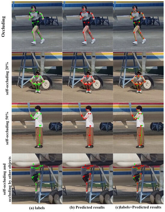 To compare the prediction error more intuitively and further validate the robustness of the human keypoint detection module, the visualization results of the actual skeleton points with and without occlusion are shown in Figure 13, where only part of the region containing the human body target is intercepted due to the large size of the original image. The green skeleton points in the figure indicate the actual values, and the red skeleton points indicate the predicted values. It can be seen by comparing the experimental results that the human keypoint detection model can still accurately detect the position of each human keypoint when it is used for skeleton point recognition in the scene with occlusions. As shown in Figure 14, comparing Figure 14b,c, it can be seen that the improvement of YOLOX-s reduces missed detection due to occlusions.