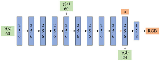 The neural radiance field (NeRF) model utilizes an MLP network trained with the input of three-dimensional coordinate positions and spatial point directions , where and represent horizontal and vertical azimuths, respectively. The network outputs the color of spatial points and the density of corresponding positions (voxels) . In the specific implementation, the position information of x and d is encoded initially. Subsequently, x is fed into the MLP network to produce and a 256-dimensional intermediate feature. This intermediate feature, along with d, is jointly input into a fully connected layer for color prediction, culminating in the generation of a two-dimensional image through volume rendering. The network structure of the NeRF is depicted in Figure 1.