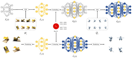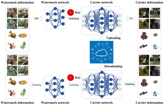 Digital watermarking is a copyright protection technology that embeds copyright identifiers into digital media using algorithms [1,2,3]. In the event of copyright disputes, copyright owners can extract copyright information from digital media using the inverse operation of the embedding algorithm to confirm ownership. The concept of neural radiance fields (NeRFs), introduced by Mildenhall et al. [4], utilizes multilayer perceptrons (MLPs) to implicitly represent 3D scenes and render 2D images by synthesizing new perspectives. Due to the NeRF’s robust representational capabilities, high generalization, and ease of learning, it is poised to become a mainstream technique in digital media representation. However, training NeRF models is challenging, and the theft of such models can lead to significant losses for their owners. Therefore, safeguarding NeRF model copyrights is of paramount importance.