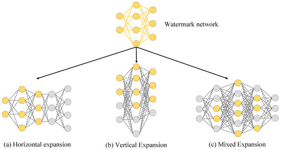(1) Horizontal expansion. This strategy entails the insertion of new layers subsequent to the watermark network, preserving the original network structure, to construct a larger network, as illustrated in Figure 5a. (2) Vertical expansion. An alternative approach to expanding the network is to maintain the layer count unchanged. Given that both the watermark and extended networks embody the NeRF model, aside from the input and output layers, we augment solely the count of neurons within the hidden layers, as depicted in Figure 5b. (3) Mixed expansion. Mixed expansion encompasses both horizontal and vertical expansion, concurrently increasing the layer count and the neuron count within existing hidden layers. This constitutes a versatile operation, as demonstrated in Figure 5c, where the entirety of the watermark network’s content and parameters are encapsulated within a single network. Indeed, both horizontal and vertical expansion can be encapsulated under the umbrella of mixed expansion, and our objective is to construct the carrier network’s structure using expansion methodologies that are as simplistic as is feasible.