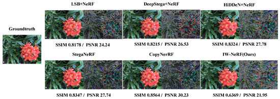 Baselines. To the best of our knowledge, there exists limited research on watermarking specifically tailored for NeRF applications. Thus, we conducted a comparative analysis with established watermarking techniques adapted for NeRF to ensure a comprehensive evaluation: (1) LSB [6] + NeRF: here, we employed the LSB algorithm to embed watermark data into the dataset images before NeRF model training; (2) DeepStega [37] + NeRF: preceding NeRF model training, we leveraged the two-dimensional watermarking approach of DeepStega for image processing; (3) HiDDeN [19] + NeRF: prior to NeRF model training, the image underwent processing utilizing the HiDDeN scheme; (4) StegaNeRF [13]; and (5) CopyNeRF [14].