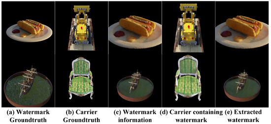 By examining the outcomes outlined in Table 1 and Table 2, a notable observation is the ineffectiveness of the two-dimensional watermarking techniques applied to the NeRF model in retrieving watermark information. The alteration of information embedded via the two-dimensional watermarking method due to NeRF’s view synthesis led to the method’s failure. Conversely, the utilization of three-dimensional watermarking approaches facilitated accurate extraction of watermark information. Notably, while other algorithms incorporate bit strings into the model, our methodology visualizes the 3D reconstruction and watermark extraction effects. Our experimentation involved utilizing diverse 360-degree scenes such as ‘Lego’, ‘drums’, and ‘chairs’ from the NeRF Semantic dataset for training the watermark network and carrier network. The resulting experimental findings, as illustrated in Figure 7, showcase various images representing original watermark information, carrier information, samples from both the watermark and carrier networks, and extracted watermark network samples. Despite our method slightly affecting the NeRF model’s training performance, it demonstrates the ability to extract embedded watermark information from the carrier network without loss. Noteworthy is the incorporation of a neural network capable of implicitly representing a range of copyright materials (e.g., images, sounds, videos) in real-world scenarios.