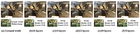 Carrier network layer modification. To further optimize 3D reconstruction outcomes, adjustments to both the watermark network size and the carrier network dimensions were explored. The watermark network was kept at a fixed size of 10 layers, while carrier networks ranging from 18 to 26 layers were utilized in training the carrier model. The hidden layer width was set to 128 for the watermark network and 256 for the carrier network. PSNR values illustrating the comparison between images rendered by the carrier model trained on different layers of the carrier network and the original images is depicted in Figure 10. Additionally, Figure 11 showcases SSIM values representing the comparison between the rendered image and the actual image of the carrier network across varying layers. The impact of the expansion rate on the PSNR values between the rendered and real images of the carrier network is detailed in Table 4. The experimental findings reveal a positive correlation between the depth of the carrier network and the expansion rate, leading to an enhancement in the reconstruction quality of the carrier model. However, it is worth noting that an increase in the number of layers of the carrier network introduces higher computational complexity and training challenges, potentially reducing training efficiency. For future research directions, the adoption of multiresolution hash encoding [38] is under consideration to boost training speed.