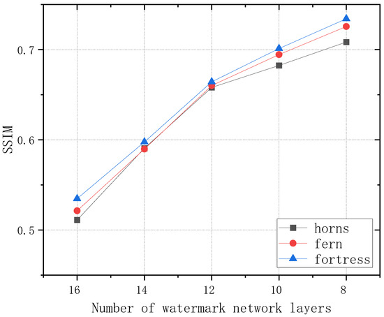 Watermark network layer modification. In our approach, the utilization of INR to represent watermark information enables a smaller watermark neural network to achieve superior carrier data reconstruction during the fitting process. By adjusting the size of the watermark network, we can influence the performance of the carrier network fitting. Specifically, we maintained a fixed size of 22 hidden layers for the carrier network and employed hidden layer networks with 16, 14, 12, 10, and 8 layers for training the watermark information. The hidden layer width for the carrier network was set at 256, while for the watermark network, it was set at 128. Our experiments were carried out using the LLFF dataset. Figure 8 illustrates the performance of carrier models trained with varying watermark networks, showcasing rendered images by both the carrier and watermark networks in the respective columns. Furthermore, Figure 9 displays the SSIM values between the rendered and real images of the carrier network across different watermark network levels. Table 3 depicts the impact of the expansion rate on the PSNR values between the rendered and real images of the carrier network. Notably, our experimental results highlight that with a consistent size for the carrier network, reducing the number of layers in the watermark network leads to an increase in the expansion rate and the complexity of the carrier network, consequently enhancing the quality of the carrier model.