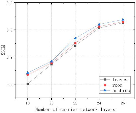 SSIM values between the images rendered by the carrier NeRF model and the carrier dataset images under different carrier network layers.