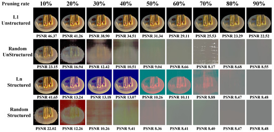 In practical scenarios, the vulnerability of our model to malicious attacks necessitates an assessment of the robustness of our watermarking scheme against various model alterations. To evaluate the resilience of our algorithm, we employed two common modifications. Model pruning is a vital technique, especially for MLP networks known for their robust fitting capabilities but often burdened with numerous parameters due to deep network layers and high neuron counts. The abundance of parameters not only escalates computational demands in deep learning but also presents an opportunity for optimization through pruning. The primary objective of network pruning is to reduce redundant parameters while preserving the original network’s performance. Our experiments encompassed unstructured pruning, structured pruning, random structured pruning, and random unstructured pruning methods. During the pruning process, the parameter with the minimum absolute pruning rate p% (ranging from 10% to 90%) was set to 0 for the NeRF model embedded with watermarks. Subsequently, we compared the extracted watermark information postpruning with the prepruning data to assess its impact on our watermark framework. Ideally, a model thief aims to render the extracted watermark information inaccurate postpruning while retaining the model’s performance. Figure 12 and Figure 13 illustrate the influence of pruning rates on watermark extraction performance under various pruning methodologies. Notably, even with unstructured pruning removing 90% of parameters, our embedding method demonstrated high accuracy in watermark extraction (with an SSIM value of 0.8829 between the extracted and original watermark information). Conversely, structured pruning, random structured pruning, and random unstructured pruning methods exhibited a significant reduction in extracted watermark quality beyond a 10% pruning rate. However, while these pruning methods may compromise watermark quality, they also detrimentally impact the model’s performance, rendering the stolen model ineffective. Thus, our watermark algorithm exhibits robustness against pruning modifications, ensuring that any attempts to maintain the model’s quality post-theft come at the cost of significantly reduced model performance.