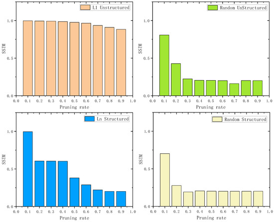 SSIM values between the original watermark image and the extracted watermark image under different pruning methods.