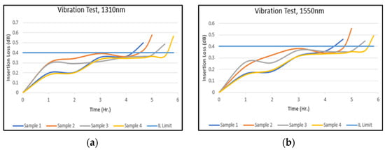 Vibration test insertion loss results with wavelengths (a) at 1310 nm; (b) at 1550 nm.