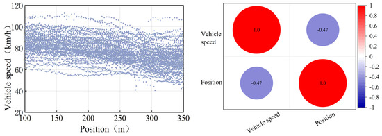 Spearman’s correlation analysis was conducted on two parameters, vehicle position (m) and vehicle speed (km/h), within Interchange X. The resulting Spearman correlation coefficients are depicted in Figure 3.