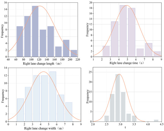 where denotes the transverse distance of the lane change (m), represents the transverse position of the vehicle at the moment (m), and signifies the transverse position of the vehicle at the initiation and completion of the lane change (m), corresponds to the longitudinal displacement during lane change, which is the length of the lane change (m), is the longitudinal average vehicle speed in the process of lane change (m/s), stands for the total width of transverse displacement during the lane change (m), is the emergency coefficient of the lane change, while denotes the duration of the lane change (s).