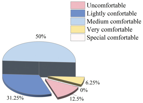 The number of driving errors among the 16 subjects amounted to 2, resulting in a driving error probability of 12.5%. The complexity and abundance of place names exhibited on the signboards guiding toward the Interchange X exit significantly contributed to the subjects’ inability to swiftly extract pertinent information. Consequently, subjects faced challenges in efficiently locating useful information within a limited timeframe. Based on the questionnaires completed by the subjects at the experiment’s conclusion, the summarized feedback regarding comfort is illustrated in Figure 10.