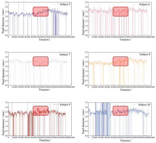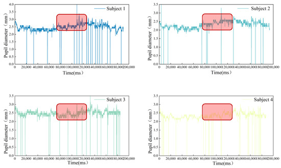 The pupil diameter was chosen as the evaluation index for the physiological measurement method. Subjects’ pupil diameter data were collected using the SMI ETGTM spectacle-type eye-tracking device. BeGaze 3.6.52 analysis software processed the pupil diameters of the subjects in each driving scenario to ascertain the characteristics of their pupil diameter variations. Larger amplitude fluctuations and more frequent pupil diameter fluctuations indicated higher physiological driving loads among the subjects. The changes in the subjects’ pupil diameter data are shown in Figure 12.