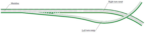Based on the road environment and geometric design elements present at a specific interchange (Interchange X) in Xi’an, China, the simulation test employs the UC-win/Road software to construct a comprehensive three-dimensional representation of the roadway. Notably, the primary route of Interchange X, designated for the Jingkun Freeway, supports a vehicle speed of 120 km/h, with four lanes in each direction. Meanwhile, the ramps cater to a vehicle speed of 60 km/h, accommodating two lanes in one direction. The simulation model should emphasize the green surroundings alongside the freeway, as depicted in Figure 8.