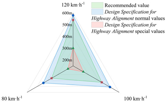 The Green Book does not specify an exact value for the decision sight distance. In contrast to the Design Specification for Highway Alignment, as depicted in Figure 15, it is evident that the specified sight distance values fall below the recommended values across all design vehicle speed levels. Given the unique nature of the right-turn ramp on the left, relying solely on these specified values for exit recognition of visual distance might pose challenges in meeting the visual distance requirements for drivers within the interchange exit section, potentially compromising diversion efficiency and safety. Therefore, it is necessary to consider augmenting the recognized visual distance based on an appropriate increase beyond the specified norms.