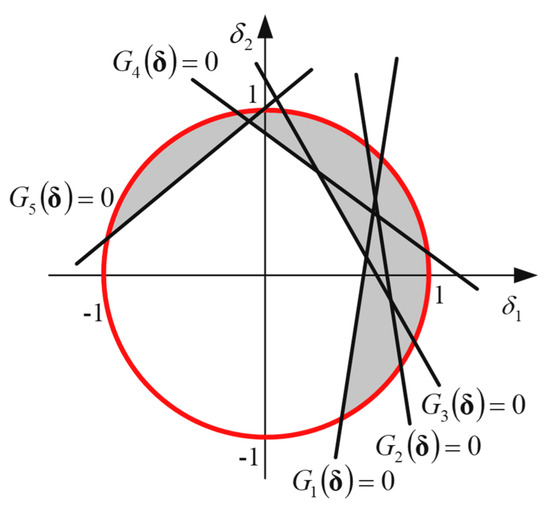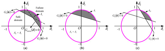 The five cases in Figure 5 can be identified by the four special points , , , and . is the point at the intersection of three failure surfaces, , , and , and the closest point to the origin. Similarly, is the point that is located at the intersection of two failure surfaces, and , and has the minimum distance to the origin.