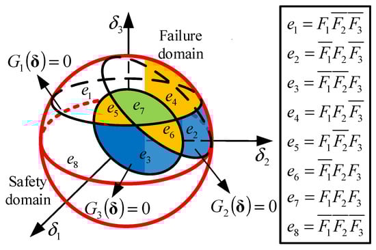 Similar to Song’s method, the sample space of the component states can also be grouped into mutually exclusive and collectively exhaustive (MECE) events, each of which is denoted by and represented as a distinct intersection of the failure events and their complements . Figure 2 schematically shows the MECE events of a tricomponent series system in a three-dimensional space. Each of the MECE events corresponds to a non-probabilistic measure, which is defined as the ratio of its corresponding multidimensional volume to the multidimensional volume of the entire convex model.