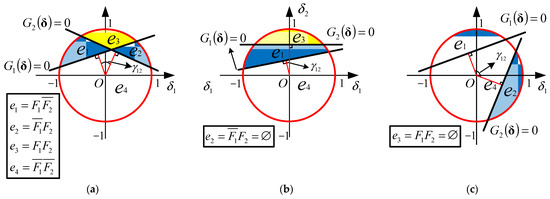 As shown in Figure 3a, a bicomponent system generally involves four MECE events, namely , , , and , which may theoretically be empty. However, here we only consider the cases of shown in Figure 3b and shown in Figure 3c, where denotes an empty set. The reasons for this is that (1) the system will completely fail when the event is empty, (2) and can be regarded as the same type of events due to their symmetry, and (3) and are non-empty and unequal, and hence, and cannot occur simultaneously.