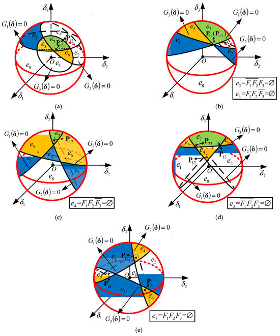 The five cases in Figure 5 can be identified by these special points and the relative positions between the failure surfaces. Taking Figure 5a as an example, the point is in the unit sphere, and the point does not coincide with the point . There are no empty events in the system. The recognition criterion is as follows: