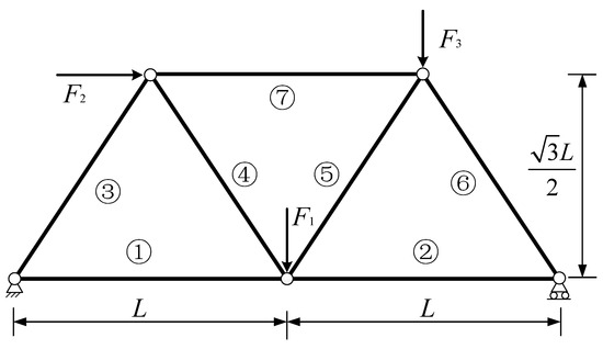 In Figure 9, a gate-shaped frame problem [29] is modified and used as example 2. The length of each bar is , and the cross-section areas (for i = 1, 2, 3, 4, 5, 6, 7) are , , , , , , and , respectively. Three concentrated loads, , , and , are uncertain interval variables with the marginal intervals , , and , respectively.