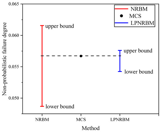 Table 4 shows that the LPNRBM can provide narrower bounds than the NRBM, that is, the former has a greater lower bound and a smaller upper bound than the latter (their maximum relative errors are respectively 0% and 5.6307%). This indicates that even though the NRBM considers all possible component-sorting alternatives, it cannot provide the best possible bounds based on the existing information. By contrast, the LPNRBM exhibits markedly higher precision than the NRBM and does not rely on ordering to offer the best possible bounds for the existing information. The proposed method reaches the limit of the bounds method, namely the exact solution in this example. For bounds on a system with a non-probabilistic failure degree, narrower bounds mean a higher accuracy. Thus, for this example, the LPNRBM may be a better choice.