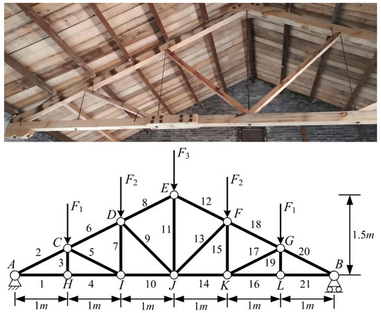 The wooden roof truss structure of a specific residential building shown in Figure 11 is investigated. Considering the symmetry of the structure, we only analyze bars 1–11. The maximum load limits , as well as the loads , , and , are treated as uncertain variables, and their distribution parameters are given in Table 7.