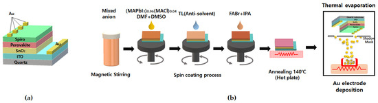 During this study, we purchased all experimental materials from commercial companies and used them without any additional purification process. Firslty, a quartz glass substrate (2 cm × 2 cm, Substrate thickness < 0.1 mm) coated with Indium Tin Oxide (ITO, Film thickness < 150 nm, Sheet resistance < 8 ohm/sq) was provided by the company TMA (Seoul, Republic of Korea). Tin(IV) oxide (SnO2, Alfa Aesar, Haverhill, MA, USA) was used as colloidal solution of 15 wt.% in water. We used methylammonium iodide (CH3NH3I, MAI), methylammonium hydrochloride (CH6ClN, MACl), and formamidinium bromide (CH5BrN2, FABr) that were produced from Greatcell Solar Materials. Ethyl alcohol (≥99.5%) was purchased from Duksan Pure Chemical Company. Pb(II) iodide (PbI2, 99.999%), 1-butyl alcohol (C4H9OH, ≥99%,), sodium dodecylbenzenesulfonate (SDBS, CH3(CH2)11C6H4SO3Na), acetonitrile (ACN, C2H3N, 99.93%), dimethyl sulfoxide (DMSO, (CH3)2SO; ≥99.9%), N,N-dimethylformamide (DMF, HCON(CH3)2; 99.8%), spiro-MeOTAD (C81H68N4O8; ≥99%), 2-propanol (IPA; 75 wt.%), lithium bistrifluoromethanesulfonimidate (CF3SO2NLiSO2CF3; ≥99.0%), toluene (99.9%), and 4-tert-Butylpyridine (C9H13N, 98%) were used and supplied from Sigma-Aldrich Chemical sciences company (St. Louis, MO, USA).