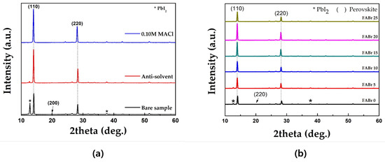 The thin films produced in this method are labeled with FABr 0, 5, 10, 15, 20, and 25 (mg) depending on the Br− mixture. Figure 2 shows the XRD patterns. This pattern indicated the formation of crystals in the thin film. Figure 2a shows the XRD patterns of bare MAPbI3 coated at 4000 rpm, MAPbI3 with the antisolvent process, and the MAPbI3 thin film with 0.10 M MACl. As shown in Figure 2a, sharp diffraction peaks are observed at 2θ = 14.12° and 28.46°, which are assigned to the planes (110) and (220), respectively. For the bare coating at 4000 rpm, the 12.5° (001) peak of PbI2 was very large. This can be attributed to the formation of PbI2 crystals owing to the thermal decomposition of CH3NH3I [26,27,28]. In the case of MAPbI3, with the addition of an antisolvent process, the PbI2 peak decreased rapidly compared with the bare MAPbI3, and when 0.10 M of MACl was added, the PbI2 peak became negligibly small. The sizes of the MAPbI3-coated crystal for each variable calculated using the Debye–Scherrer equation were approximately 38.02, 36.37, and 34.85 nm. The XRD peak attributed to the (110) crystal plane of the MAPbI3 film with the addition of 0.10 M MACl shifted to a larger diffraction angle of 14.18°. The lattice constant calculated using Bragg’s law was 3.156 Å at a diffraction angle of 14.12°, and decreased to 3.1432 Å at 14.18°. The lattice constant is believed to decrease because of the addition of Cl, which has a smaller atomic radius. This suggests that, in this study, a UV PD with improved performance was fabricated by adding MACl to the precursor solution. Figure 2b illustrates that the crystallinity of the film steadily enhances with increasing FABr content in the MAPbI3 precursor solution with the addition of 0.10 M MACl. The reduced peak intensity of FABr 25 indicates that the high density of FABr causes particle shrinkage, which negatively affects the crystalline film formation. The optimal crystallinity is observed for FABr 20. The optical properties are improved through the anion addition process, which means that the performance of PD is improved [29].