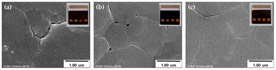 Figure 3 shows the results of observing the surface morphology of each perovskite film using SEM. By adding MACl to the precursor solution, overall, a more stable surface formation was observed compared with that of the MAPbI3 thin film without the addition of MACl. As the post-treatment solution was added, the surface of the film was stabilized and particle formation was improved. This indicates improved photoelectric behavior, characterized by extended carrier lifetime and enhanced light absorption [30,31]. Figure 3a shows that in the case of the bare MAPbI3 film, the particle size is not uniform, pinholes are observed, and surface formation is unstable. Additionally, PbI2 residues are observed, which may be due to the dewetting phenomenon [32]. Therefore, the thickness of the thin film in the vertically structured device becomes unstable and deteriorates in quality. The thin film of MAPbI3 with the added anti-solvent process in Figure 3b shows a more uniform surface than Figure 3a. The MAPbI3 thin film with 0.10 M MACl added in Figure 3c forms large perovskite particles due to its high surface coverage, facilitating the movement of electrons and improving device performance. Consequently, Figure 3 shows that adding an anti-solvent process or adding Cl anions to MAPbI3 affects the structural change in the perovskite, resulting in a change in its properties [33].
