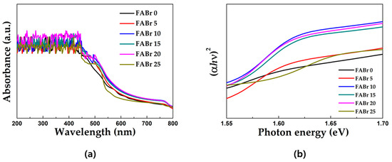 (a) UV–vis absorbance spectra and (b) bandgaps of films with different amounts of FABr added.