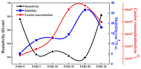 Electrical properties (Resistivity, Mobility, and Carrier concentration) of samples as a function of FABr 0−25.