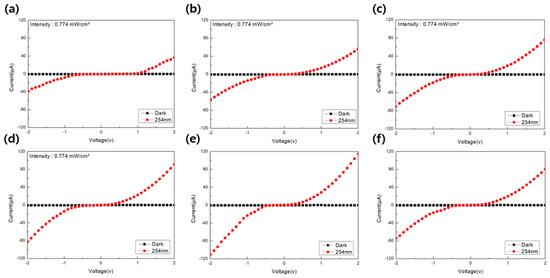 I-V characteristics of the (MAPbI3)0.96(MACl)0.04-based PD (a) FABr 0, (b) FABr 5, (c) FABr 10, (d) FABr 15, (e) FABr 20, and (f) FABr 25.