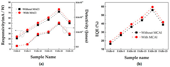 Figure 7b illustrates the external quantum efficiency (EQE) of the PD as a function of the amount of FABr added. The EQE refers to how much photon is produced compared to injected electrons in the device (PDs) and the value shows the ratio of the number of photons versus electrons. A high EQE indicates a good PD conversion efficiency. With increasing FABr content, the EQE values at 2 V increased to 19%, 28%, 39%, 47%, and 60% for FABr 0 to FABr 20, respectively. However, for FABr 25, the EQE decreased to 42%. Overall, the MAPbI3 perovskite film mixed with MACl shows more improved performance parameters than the previous study. This means that the mixed anionic film has superior photoelectric properties than the single film.