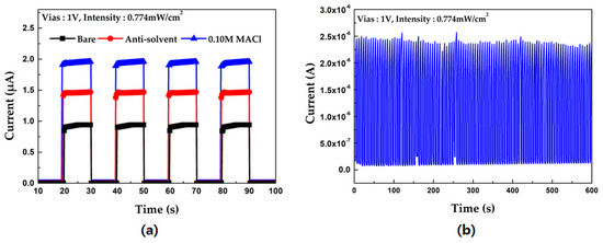 Figure 8a shows the ultraviolet (UV) detection performance evaluation of PDs without and with MACl. The response properties of MAPbI3 were measured at a bias voltage of 1 V and a 254 nm light source with a light intensity of 0.774 mW/cm2. If the signal input to the manufactured photodetector changes with time, a delay occurs until it reaches the output of the device, and this is the response time. There is an inverse correlation between response speed and response time and these are important factors in evaluating PD performance. Rise/decay times show rise/decay times of 46.1 ms/44.3 ms, 39.2 ms/45.9 ms and 36 ms/32 ms. Figure 8b shows the ON/OFF repeatability of the MAPbI3 sensor with 0.10 M MACl added at a 254 nm light source with a light intensity of 0.774 mW/cm2. For the first time, the photocurrent was 2.19 μA, and after 100 repetitions, the photocurrent was 2.53 μA. It can be seen that reproducibility is continuously maintained compared to the initial photocurrent. It demonstrates the stability of the PD.