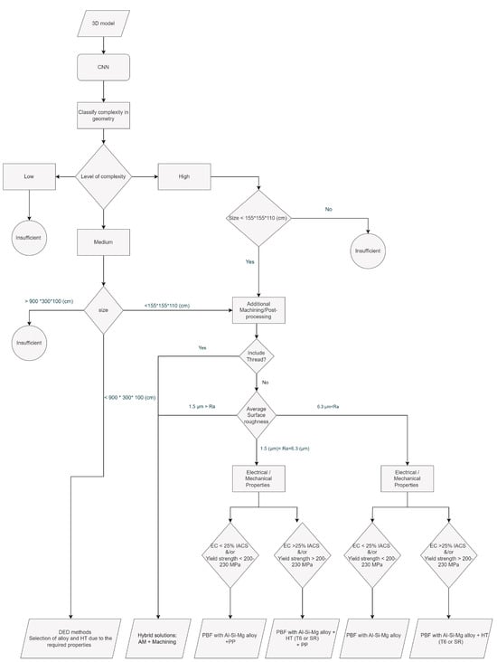 According to the proposed flowchart, if the part complexity is medium and the size is smaller than 155 cm *155 cm *110 cm, two options can be considered. One option is the Directed Energy Deposition (DED) method with consideration of any necessary heat treatment and the selection of alloy type due to the required electrical/mechanical properties. The second option is printing by PBF-based methods and considering any potential heat treatment, machining, or post-processing. The example in Table 3 shows the path through the flowchart for one part, and the red arrows show the direction of selection due to the technical specifications and requirements. Other examples are summarized in Table 4.