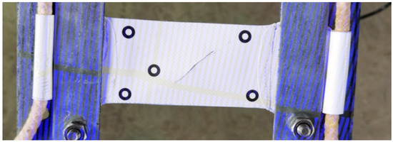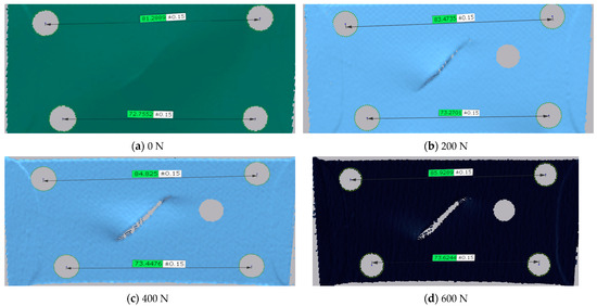 The experimental results indicate that the membrane materials exhibit brittle fracture upon failure, with the fracture surfaces being smooth and perpendicular to the direction of tension, as shown in Figure 5. By selecting calibration points on the same edge and measuring the distance between the centers of the two points as the distance between the upper and lower edges, taking Case 3 as an example, when the load is 0 N, one central position calibration point is not identified. The length changes in the upper and lower edges of Case 3 are illustrated in Figure 6, with the specific data presented in Table 4. Subsequently, the specimen underwent sudden brittle fracture during subsequent stages.
