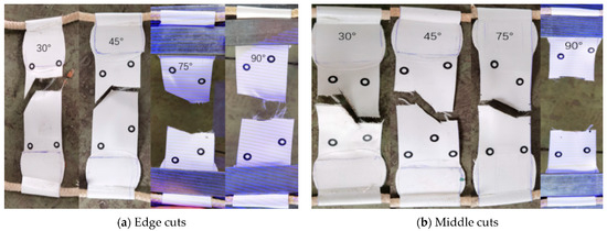 It can be inferred that as the angle of the cut seam increases, the load-bearing capacity of the membrane material decreases due to the reduction in the effective width of the membrane material. Additionally, the stiffness and ultimate stress of the membrane material decrease because the fabric in the membrane material’s coating is damaged. We can analyze the relationship between these factors by organizing the data, as shown in Table 5. Here, we mainly compare the tearing strength of Case 11 with Cases 1–5 and Cases 6–10. When the cut seam angle is 0°, the ultimate stress of the membrane material slightly decreases, but the decrease is not significant. When the cut seam angle is 30°, the effective length of the cut seam is 15 mm, accounting for 30% of the membrane material width. Compared with the result of 1, the ultimate stress of Cases 2 and 6 decreases by 42% and 41%, respectively. When the slice angle is 45°, the effective length of the cut is approximately 21.2 mm, accounting for 42% of the membrane width. At this point, the ultimate stress of Cases 3 and 8 decreases by 50% and 57%, respectively. When the cut angle is 90°, the effective length of the cut seam is about 30 mm, accounting for 60% of the membrane material width. At this point, the ultimate stress of Cases 5 and 10 is the smallest, and it decreases by 58% and 67%, respectively.