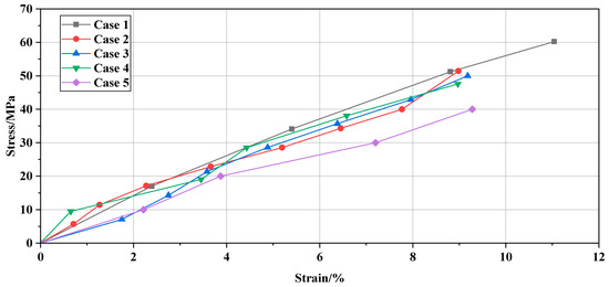The data of all the middle void specimens are summarized and presented in Figure 7. Among them, only the specimen of Case 1 did not experience failure, while the remaining specimens all suffered from failure. Case 5 exhibited the smallest ultimate stress, while Case 2 exhibited the largest ultimate stress. Overall, the ultimate stress appears to be inversely proportional to the angle. Except for Case 5, which exhibited a period of minimal deformation before failure, all the specimen curves were linear, with very small differences in the slope. Cases 2–4 maintained consistency before failure, and the difference in ultimate stress at failure was not significant. At the point of failure, the strain ranged from 0.07 to 0.09 for all specimens.