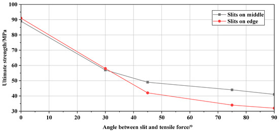The ultimate strength of each case is shown in Table 8. By plotting the curve of the angle along the cut seam and the tension force against the ultimate stress, as shown in Figure 9, we can study the relationship between the ultimate stress and the angle of the cut seam. As the angle increases, the ultimate stress gradually decreases. This relationship is nonlinear, and when the angle between the cut seam and the tension force is 90°, the load-bearing capacity is the smallest, which can be considered the most unfavorable case during failure.