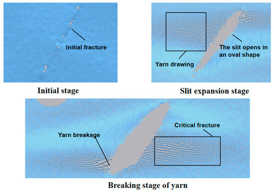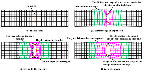 Consequently, after the fiber failure at the slit point, the entire membrane material subsequently fails. Combined with the example in Figure 10, it can be inferred that at lower stress levels, the mechanical performance of the membrane material can be considered as that of a homogeneous material, as depicted in Figure 11a; as the stress increases, the cracks in the membrane material extend to the yarns, as shown in Figure 11b; after the baseline ruptures, the cracks rapidly expand, leading to overall membrane failure, as illustrated in Figure 11c,d. It should be noted that the pink and green areas represent areas of yarn stretching deformation. The pink area deforms more than the green area.